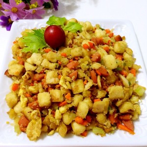 盛出摆盘,一盘颜色漂亮又有营养的时蔬炒馒头可以享用了!