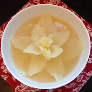 煮白菜的水取出一大碗,放入浓汤宝、黄酒、白胡椒粉和盐,浓汤宝化开后浇在白菜上即可