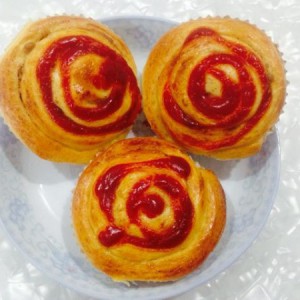 放入烤箱第二次发酵60分钟,烤箱底部放二碗热水增加湿度和温度,开烤前淋上番茄酱