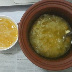 将果粒橙,银耳,冰糖,莲子一起放进锅中,用的小电炖锅,慢档,中午开始煮,刚好可以做晚饭吃。