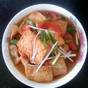 锅里剩少许油时先把五花肉放到锅里,待肉变得微黄就可以放入姜丝,然后放入辣椒翻炒十秒在放入豆腐番茄在翻炒十秒加入半碗清水这样豆腐容易入味