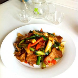 锅中放油烧热,加肉片和胡萝卜片煸炒一下,加青蒜段继续炒一下,加豆瓣酱、盐和少许水,继续煸炒至菜熟即可。