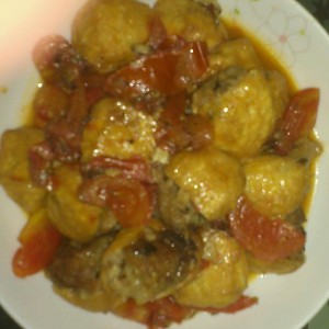 豆腐肉馅煎至金黄色加入切好的西红色,再加入高汤(没过所有的材料)收汁调味,一道颜色鲜艳口感带酸的番茄焖酿豆腐就大功告成。