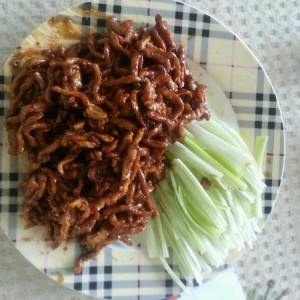 锅内放油,八成热时倒入肉丝翻炒2分钟左右,再倒入调好的酱汁继续翻炒1分钟装盘,配上豆腐皮或小饼,美哉