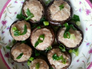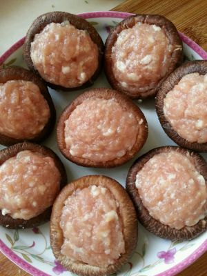 肉馅搅拌好后先在每个香菇里洒上一层薄薄的细盐,这样香菇更入味,把肉依次填入香茹表面整圆!