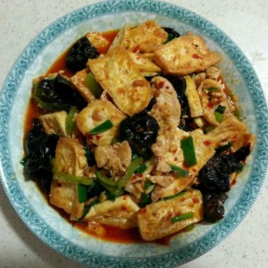 加入豆腐,青椒,木耳翻炒一小会儿。
