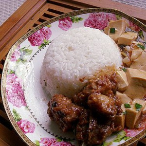 准备好一个盘子,把米饭盛入碗里,压一压,再倒扣在盘子里,旁边夹几块排骨,再舀几勺煮好的红烧豆腐或者煮豆子、青菜什么的那就更好啦!其实,红烧豆腐也很简单,先把豆腐一斤切成小方块,锅里放半碗水烧开,倒入一勺酱油、一勺料酒、一勺黄豆酱、一勺油,再次烧开后放入豆腐块和少许的肉末一起烧到沸腾,大约5-7分钟时间,再用1勺淀粉加2勺水搅拌后,倒入豆腐上面,推几下,撒一点味精、葱花就可以装在盘子里。简单、便宜、好吃!