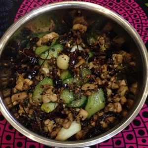 热锅冷油,油温好后依次倒入姜蒜干海椒花椒白糖,待红色辣椒变黑立马加入黄瓜片、最后加入鸡大丁,倒适量酱油,出锅撒芝麻即可。
