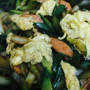 随便翻炒几下,把炒好的鸡蛋放进去。放点鸡精,就可以出锅啦!也可放点香油,特别香!