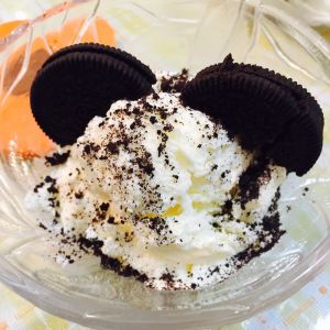 时间到!将冰淇淋挖出来,感觉硬度不够的话再放到冷冻箱里冻半个小时,再用冰淇淋勺挖出来摆盘,将奥利奥饼干压碎,撒在表面!再用一块掰成两半插在冰淇淋上,好像米奇的耳朵!大功告成!好吃极了!