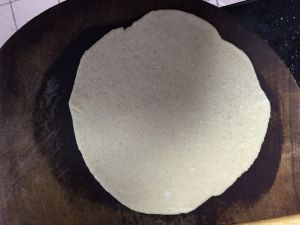 把白色面团拿出来擀成圆形。
