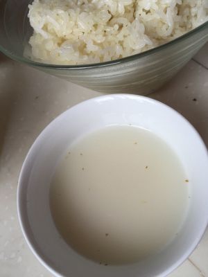 酒曲按照比例溶到温开水里,然后将酒曲水倒入不晾凉的糯米里面,拌匀。