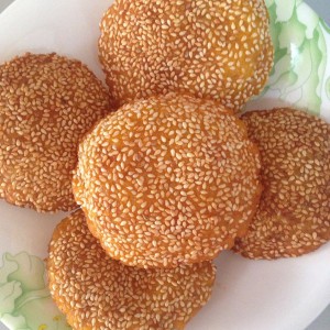 把圆型面团用双手压扁,然后在芝麻上轻轻按,让两边粘上芝麻就好