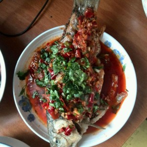 4,鱼拨到锅的一边,锅内剩下的油里放入蒜葱干辣椒花椒豆瓣酱翻炒一会倒入半碗水煮2分钟到3分钟。就可以盛盘了,汁浇在鱼身上。洒上少许香菜。