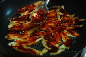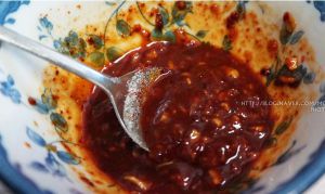 在小碗放入两勺辣椒酱,辣椒面半勺,蒜末半勺,白糖1.5勺,水一勺,芝麻一点调制好调料