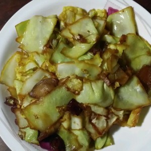 倒入包菜翻炒,加少许盐调味,放少许酱油上色,翻炒片刻后加鸡精,即可出锅