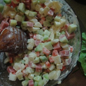 放一锅水加入3-4勺盐,关键好不好吃就在这一步,先将土豆倒入水中,等水开以后1分钟将胡萝卜丁倒入,一起煮3-5分钟,关小火倒入盐水方肉丁,同煮半分钟后关火,将黄瓜丁倒入,焯一焯水后即刻将所有食材倒入碗中。竟可能的沥干水分。放入冰箱,等待它发凉以后倒入色拉酱。