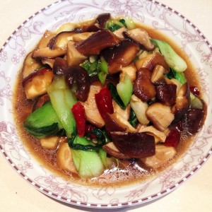 热油,待油热后下入少量姜末,葱,蒜,干红辣椒,然后下入油菜,翻炒,待油菜变软后下入香菇,再翻炒。