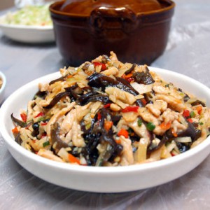 然后下入冬笋丝和黑木耳丝大火煸炒片刻;