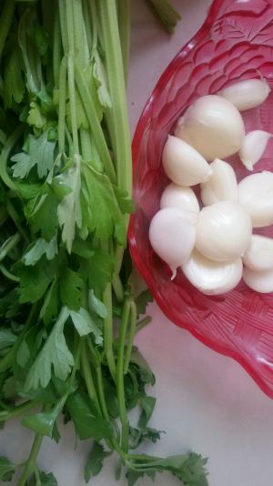 西洋芹洗净控干,蒜去皮