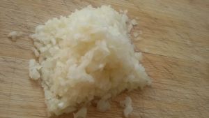 蒜加盐剁碎成泥。加盐有黏性更好剁碎。