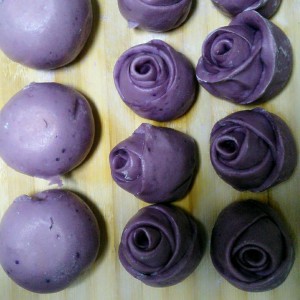 将紫薯泥和面粉揉成光滑的面团,放盆内静置,待发成两倍体积大,开始准备。