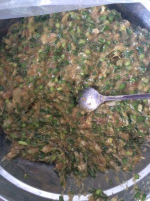 首先把网剁碎,放盐、味精、糖、酱油、料酒、鸡蛋一个、大葱、生姜、顺时针搅拌,然后放入韭菜搅拌……