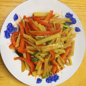 锅里加入油,红椒,土豆丝,米醋,生抽,翻炒