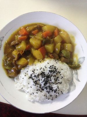 锅烧热放牛肉翻炒,再放入萝卜,青椒,洋葱炒一会儿放入水等水烧开放入咖喱,关火咖喱融化再开火煮5分钟,把饭盛盘里撒一些芝麻,把煮好的咖喱盛上就就OK啦