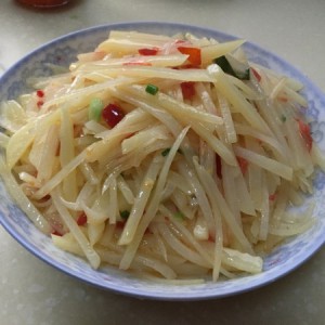 油热了后放入剁椒爆炒,然后放入土豆丝翻炒一会放入白醋和盐。
