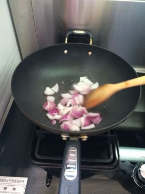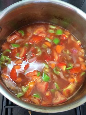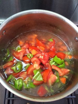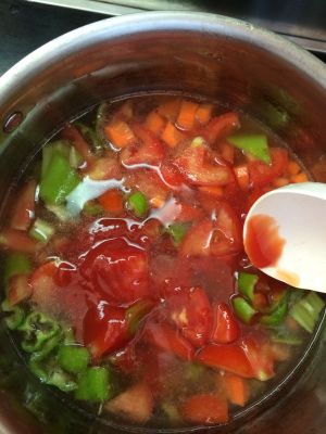 把炒好的洋葱牛肉转到汤锅,把番茄青椒红萝卜粒火腿粒也放进去