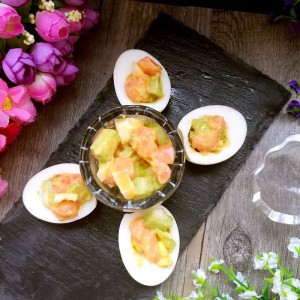1个鸡蛋连同刚挖出的2个蛋黄都切成小丁