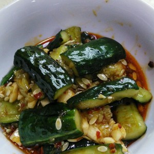 黄瓜洗净,切成喜欢的长度,用刀拍扁。拍时注意黄瓜籽会飞溅,用手挡着点哈!大蒜拍扁,和黄瓜一起放在一个较深的盆里,放适量盐腌一腌,时不时拿起盆抛一抛,让所有黄瓜都粘上盐。五分钟后将腌出来的水倒掉,这样黄瓜会更爽脆。