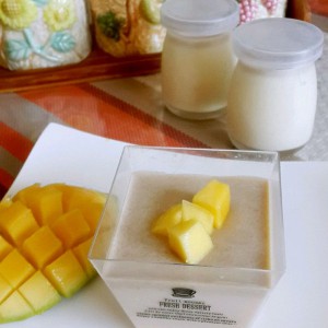 做好的布丁放入冰箱冷藏,几个小时后取出,放入芒果丁装饰即可。
