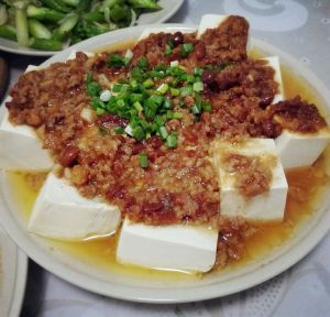 肉糜放少许蛋液、黑胡椒粉拌匀;少许油下锅,放拌好的肉糜,翻炒半熟时,放入黄豆酱2-3勺,继续翻炒两分钟,然后关火,将酱肉糜均匀铺在切好的豆腐块上。换蒸锅,蒸15分钟,即可出锅开动啦!小心烫哦