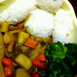 把米饭捏成大白的形状,眼睛是用紫菜做的,倒入咖喱汁,西兰花装饰一下,完美,非常完美……