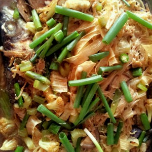 鱼烤好拿出(小心烫),将锅里的食材连汤汁一起倒在鱼身上再入烤箱220度烤6-8分钟。