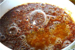 之前的油锅油温慢慢升高,香料变黑,用漏勺捞走,继续加热至油微微冒烟,关火,稍微冷却一会,冒烟时候的油温太高,辣椒干容易炸糊,颜色就不好看了