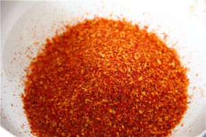将适量辣椒干擦拭一下,用料理机研磨成粗颗粒状,这一步,如果没有准备自制椒盐粉的话,少许花椒和黑胡椒一起研磨就行了