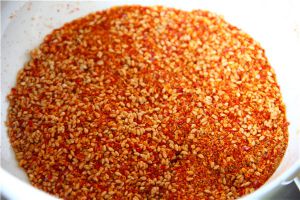 将辣椒碎和椒盐粉、炒好的白芝麻、适量的盐混合拌匀,将碗放在准备好的区域,之后碗会很烫,就不能再移动了