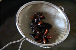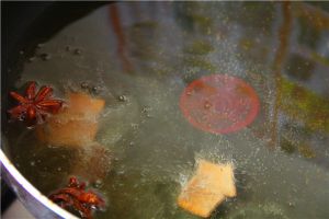 取约400ML左右的油,倒入锅中,小火慢慢加热,放入八角和桂皮,小火慢炸,激发出香味