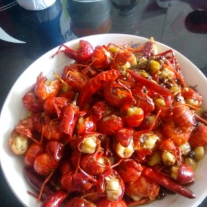 把锅烧热,在给油,大蒜,姜,花椒炒香在给龙虾,在给干辣椒,再给作料就行了