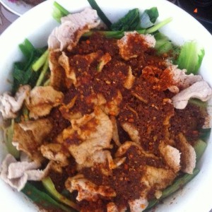 再把切好的肉片也放开水里烫熟,放在最上面