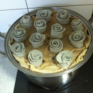3.将面团取出,搓成饺子剂,取5个饺子剂擀成饺子皮,将它们叠加,用筷子压出一条中心线,从里向外开始卷,然后用刀从中间切开,整理下花型。
