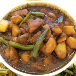 倒入豆角和土豆翻炒,加豆瓣酱、老抽、糖、鸡精、盐,加水,炖20-30分钟;