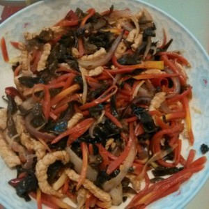 先倒油偏炒洋葱丝干辣椒出味,再放胡萝卜炒5成熟,再放木耳一起炒,最后加上备用调料拌匀炒一下,即可出锅。