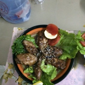 大火收汁,收到大约留有一勺汁,关火,装盘,撒上一点点芝麻,淋上一些柠檬汁,味道酸酸甜甜,又有一点点辣!
