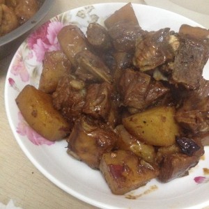锅烧热,放入适量油,加入豆瓣辣椒花椒姜炒香,依次加入排骨老抽,土豆,翻炒出香味。