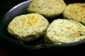 将糯米面与鼠曲草、糖、盐、食用碱混合揉搓均匀。包上汤圆馅子。用小火,慢慢的煎。火大容易焦。也不容易熟。