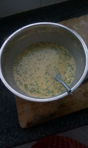 米粉糯米粉面粉按1:1:2的比例,加入酱油,耗油,鸡精,一个鸡蛋,葱花一起加水搅拌成可以挂汁就行。